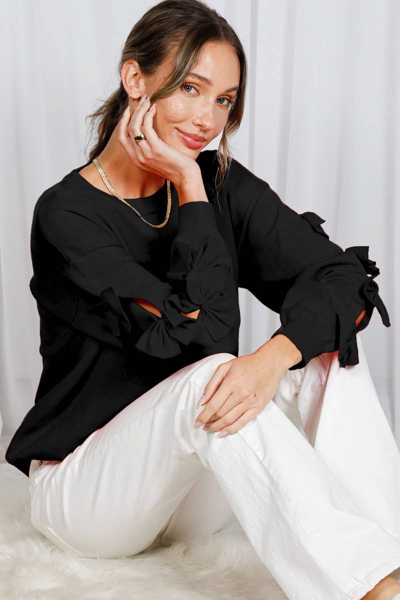 - Ribbed Crew neckline - Casual drop shoulder - Bow embellished open long-sleeve ribbed hem - The charming bow detail elevates this cozy piece, making it perfect for a touch of whimsy with your everyday look. - Pullover style - Soft touch and breathable for spring and fall casual wear. - Comfortable, relaxed fit
